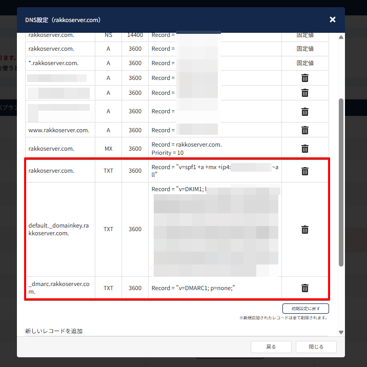 • DKIMレコード(タイプ:TXT、ホスト名:default._domainkey.ドメイン名.のレコード)